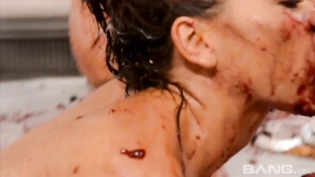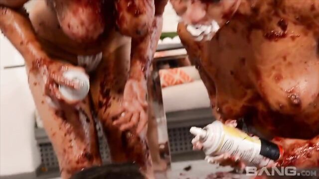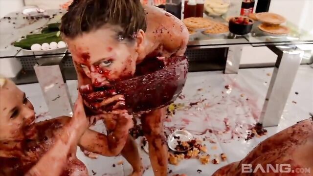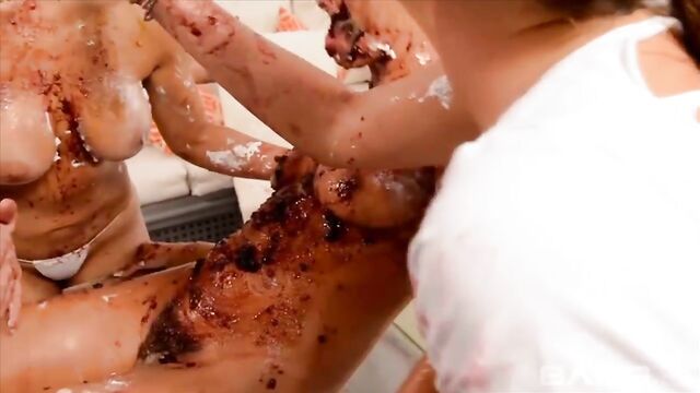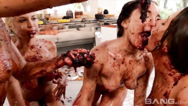 Description:Have you ever seen four chicks covered in cake as they go ass to ass with a cucumber? Well today is your lucky day! That is exactly what Sarah Vandella, Hope Howell, Gabriella Paltrova and Adriana Chechik are doing at this wild food filled lesbian orgy!